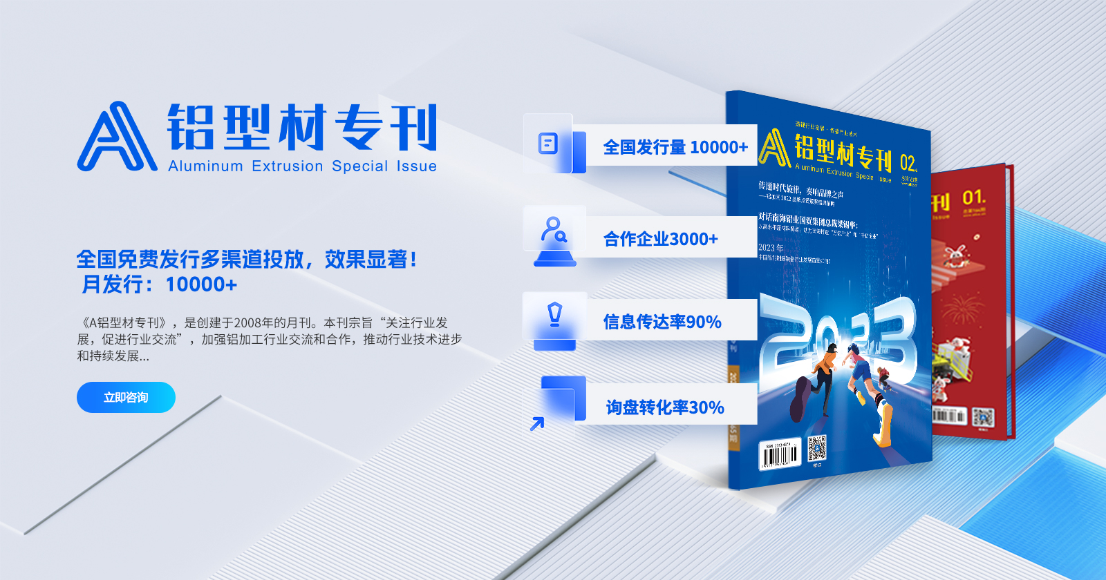 鋁加網(www.albiz.cn)是聞名鋁加工行業的垂直門戶網站,云聚鋁業新生態,構建鋁業新場景,以albiz.cn 網站為核心,以移動云端、鋁加工微信、鋁加網視頻號、《鋁型材專刊》和《鋁世界》雜志為載體,成為了鋁加工行業資訊和精準傳播的首選傳媒。鋁加網,采集和發布全行業信息資訊,提供線上展覽、在線直播、短視頻、品牌策劃、品牌運營、品牌傳播等全方位的專業服務。